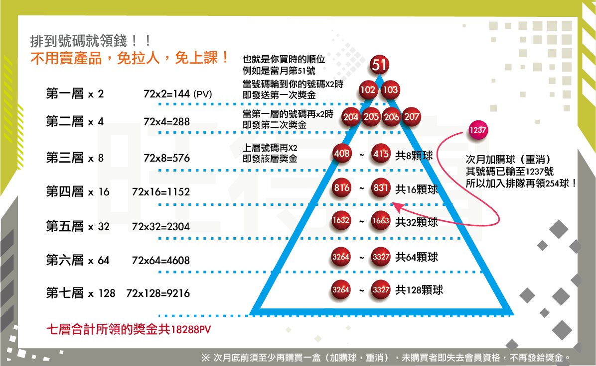 每一首購單及重消單於安置時,公司皆自上撥7層各72PV(3.6%)之安置分紅,共504PV(72x7)。而每一單實際可領取為254單(2+4+8+16+32+64+128),每單72PV,故每單可領254x72=18288PV之分紅。