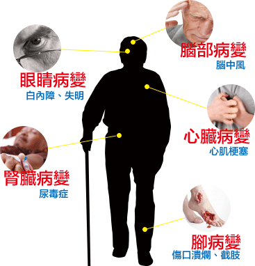- 糖尿病是複雜的慢性代謝性疾病,如果沒有積極控制,患者面臨的嚴重健康問題是產生併發症,由於高血糖而導致嚴重的疾病,傷害範圍遍及全身,將引起全身不可逆性的大、小血管及神經等病變,包括:眼睛、心臟和血管、腎臟和神經等。