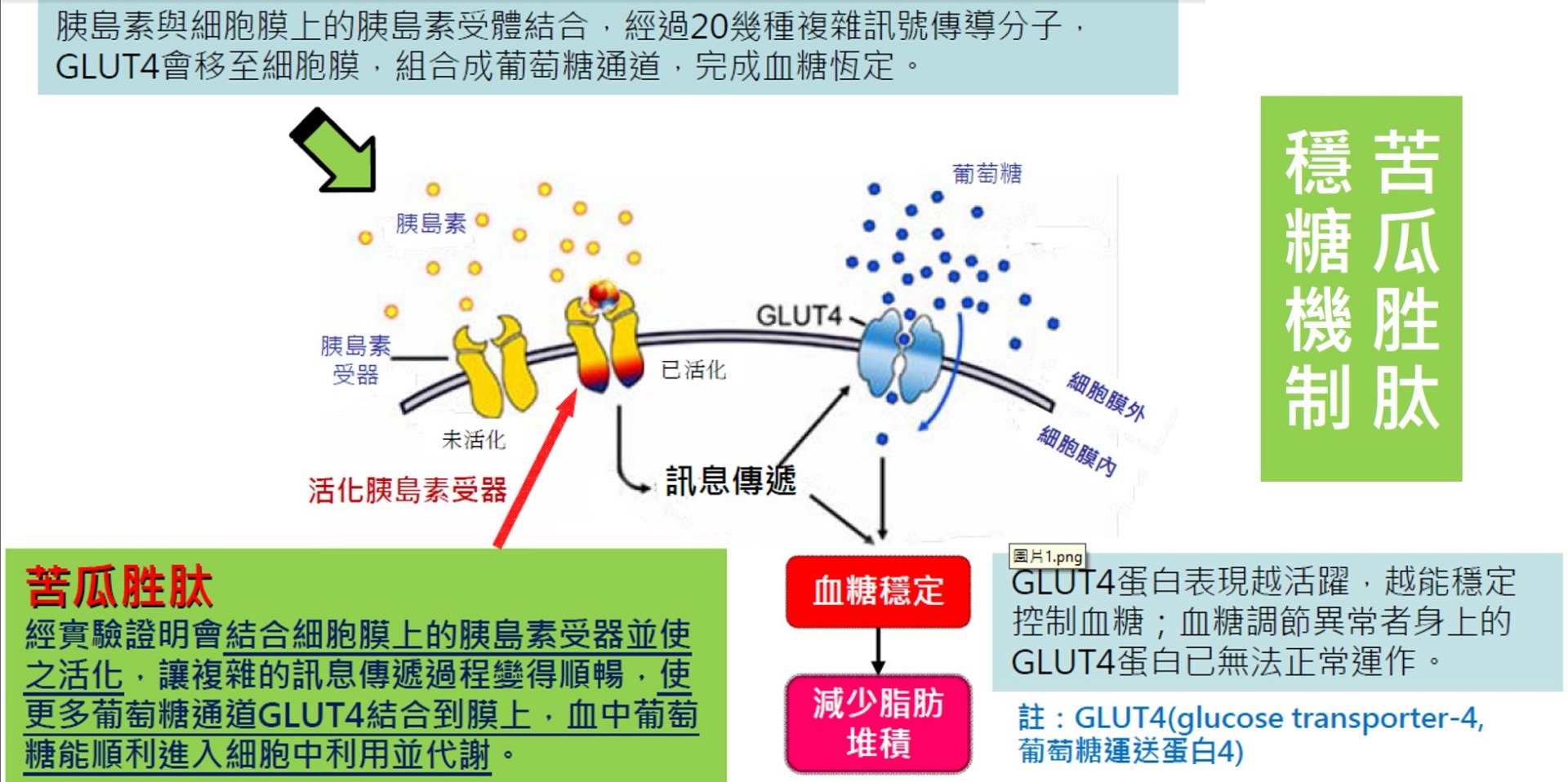 美國權威期刊「農業食品化學」證實苦瓜胜肽具有類胰島素活性,強效激活胰島素受體活性,餐後血糖降53%,糖化血色素34%,恢復血糖生理調控機能,安全無副作用。